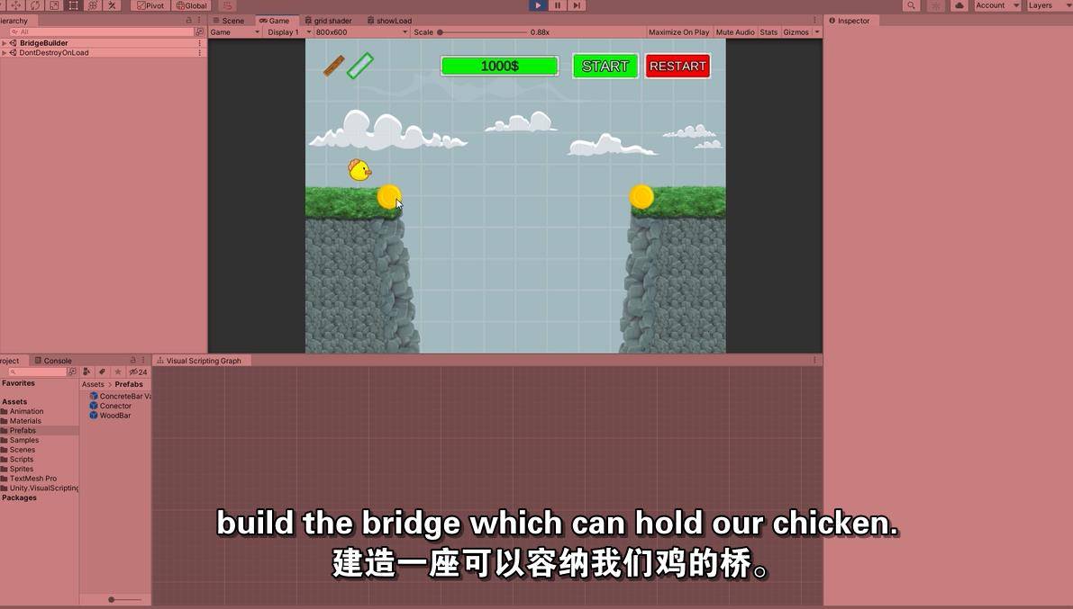 在课程中,您将学习编写代码和可视化创建图形之间的区别。最终,您将能够从互联网上获取C#代码,并在自己的可视化脚本图中使用它。我们将通过从头到尾创建您自己的建桥游戏来完成我们的课程,并完成可视化脚本(以前称为螺栓)。