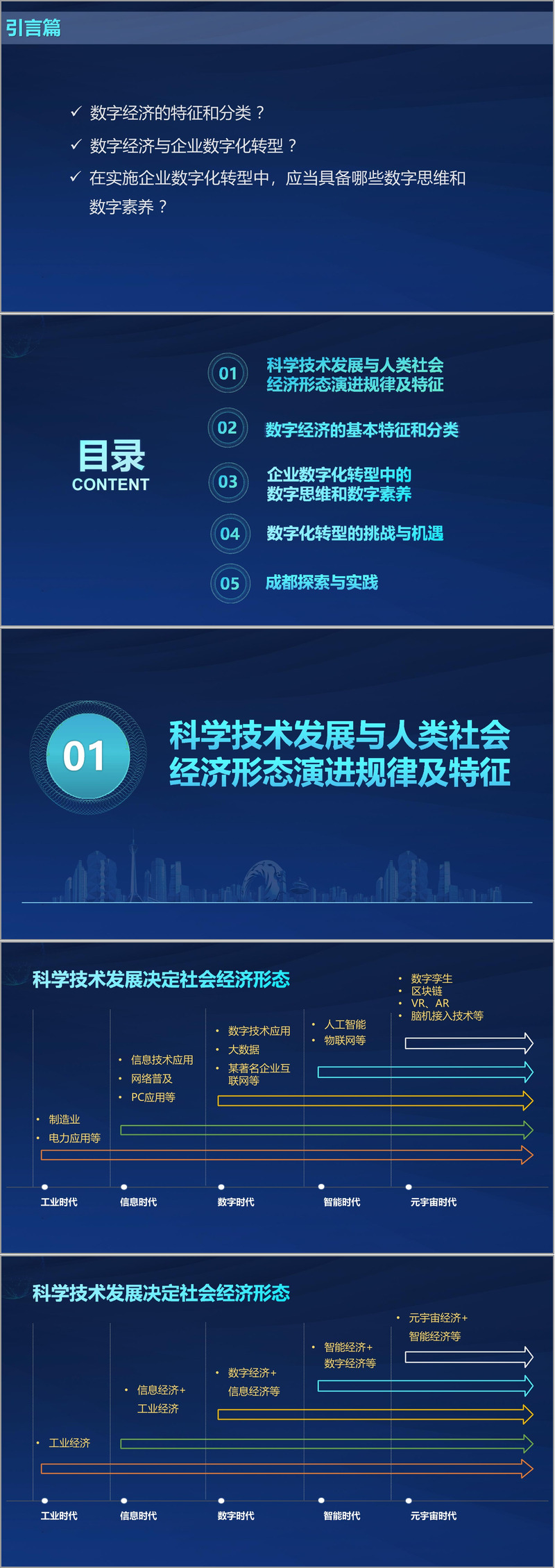 技术发展方面,数字孪生、区块链、VR/AR 等新技术不断涌现,推动社会从工业时代迈向元宇宙时代,经济形态也随之演进。同时,信息化是基础,数字化在此之上利用先进技术处理信息,而数字化转型则是企业必经之路,涉及多方面创新与建设。