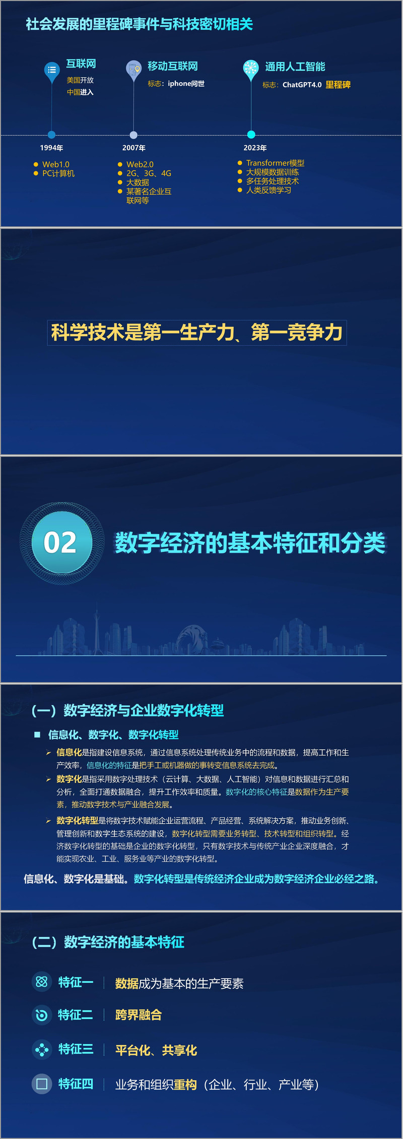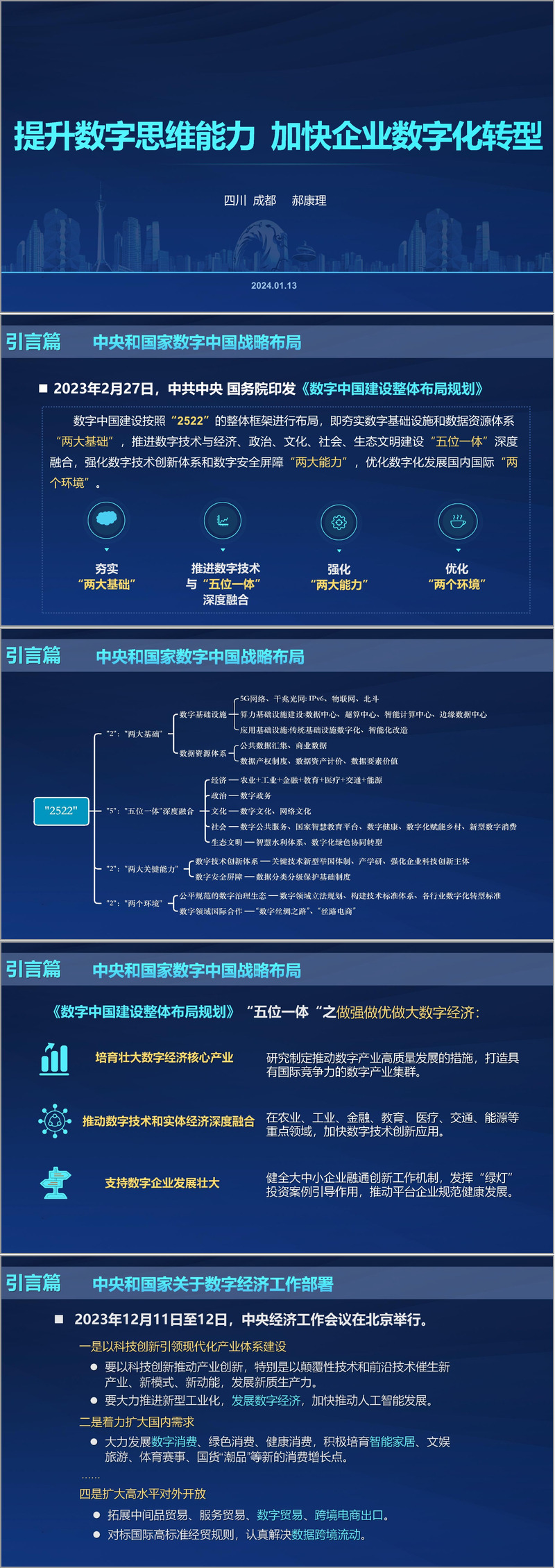 数据成为基本生产要素,其具备非实物性等属性,且分为公共、企业、个人数据;同年 12 月的中央经济工作会议,强调大力发展数字经济、推动人工智能发展等,为企业数字化转型提供了政策指引。同时,信息化是基础,数字化在此之上利用先进技术处理信息,而数字化转型则是企业必经之路,涉及多方面创新与建设。这份资料围绕提升数字思维能力、加快企业数字化转型展开,涵盖政策背景、技术发展、数字经济特征、转型思维与案例等多方