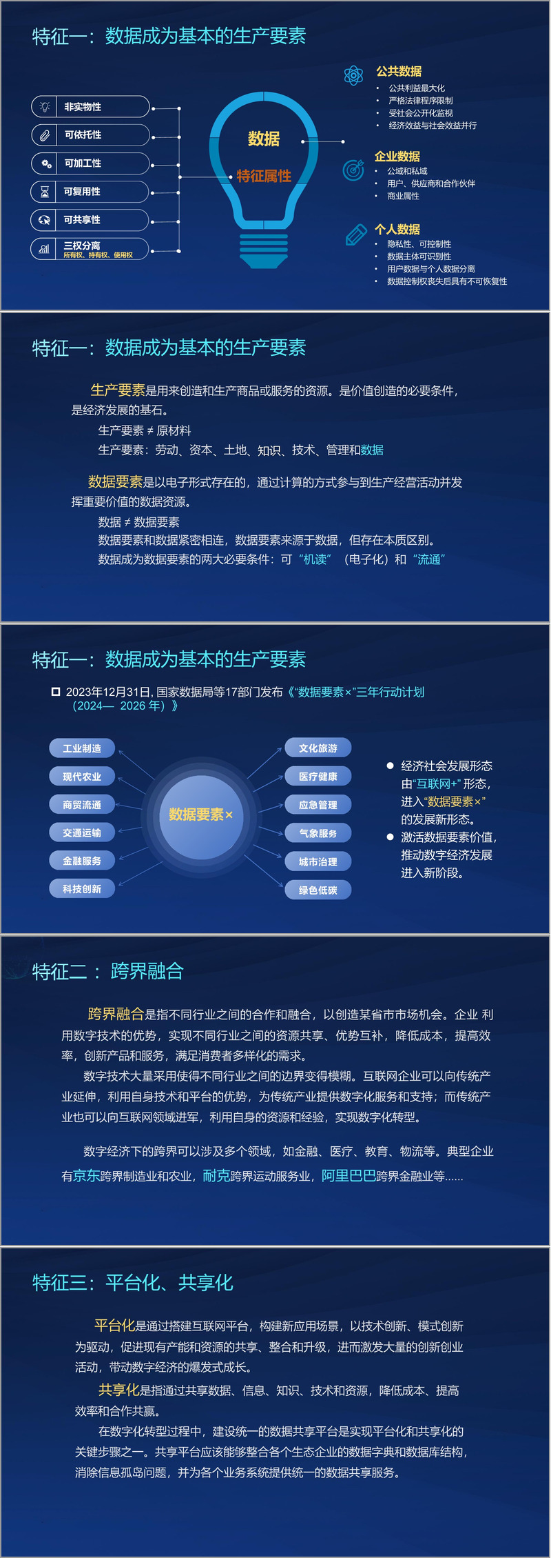 数字经济具有四大特征。数据成为基本生产要素,其具备非实物性等属性,且分为公共、企业、个人数据;跨界融合让行业边界模糊,企业可跨领域合作;平台化与共享化通过搭建平台整合资源、促进共享;业务和组织重构则推动企业运营模式及行业产业链变革。