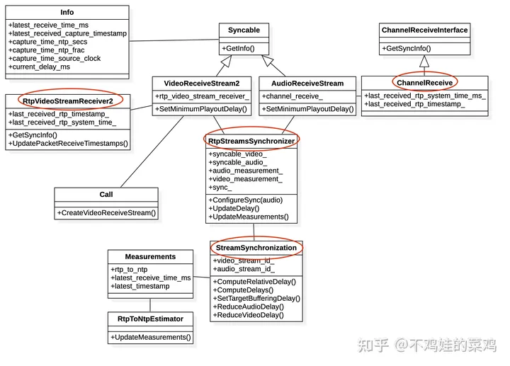 同步基本原理:就是相对时间差,即音视频流的 RTP 时间戳和到达时间的差值,通过 这个差值来计算相对延时,这样可以不用考虑双方机器时钟的偏差问题。以下是比较重 要类: