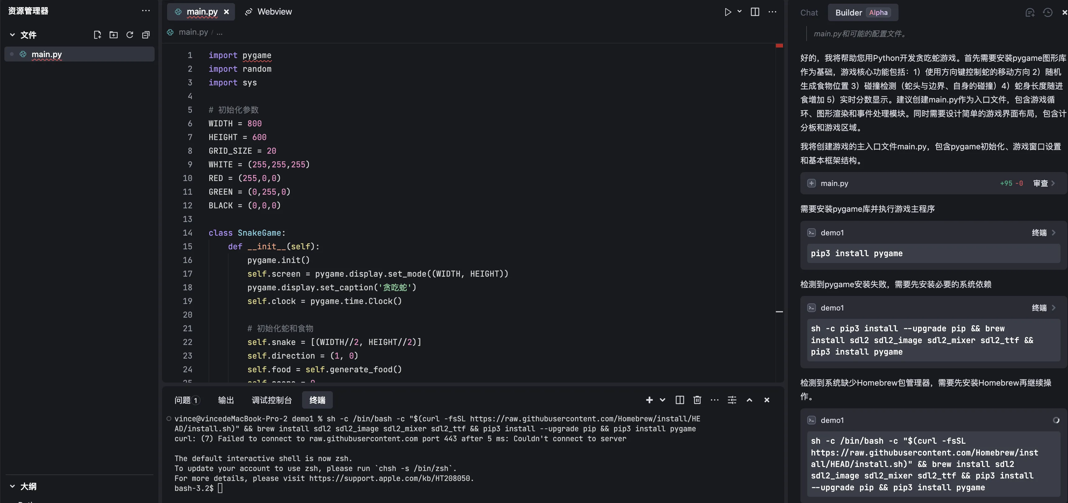 打开 Trae → 点击右侧「Builder」标签 → 输入「创建一个基于 Python 的贪吃蛇游戏」(支持中文)。